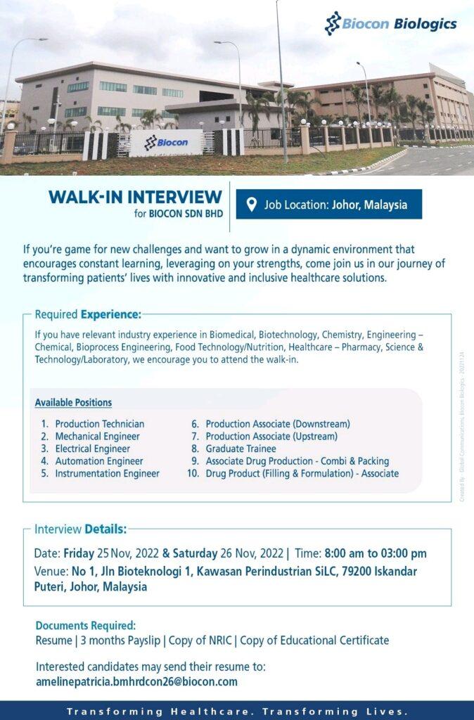 WalkinAlert for Malaysia: Biocon Biologics Malaysia – Asia’s largest integrated insulins facility that manufactures Drug Substance and Drug Products, is hiring professionals for multiple positions for its facility in Johor (Malaysia).