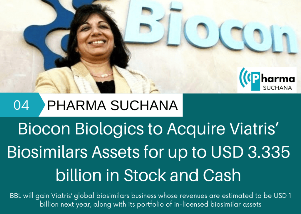 Biocon Biologics Ltd., a subsidiary of Biocon Ltd., announced that it has entered into a definitive agreement with its partner Viatris Inc. (NASDAQ: VTRS). Accordingly, Biocon Biologics Ltd. (BBL) will acquire Viatris’ biosimilars business to create a unique fully integrated global biosimilars enterprise. Viatris will receive consideration of up to USD 3.335 billion, including cash up to USD 2.335 billion and Compulsorily Convertible Preference Shares (CCPS) in BBL, valued at USD 1 billion.
