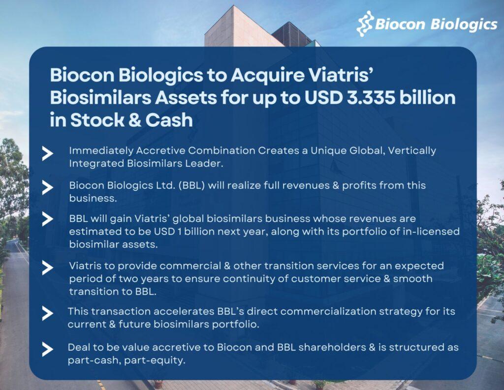 • Biocon Biologics Limited’s (BBL) acquisition of Viatris’ rights in biosimilars assets, creates a unique global, vertically integrated biosimilars leader