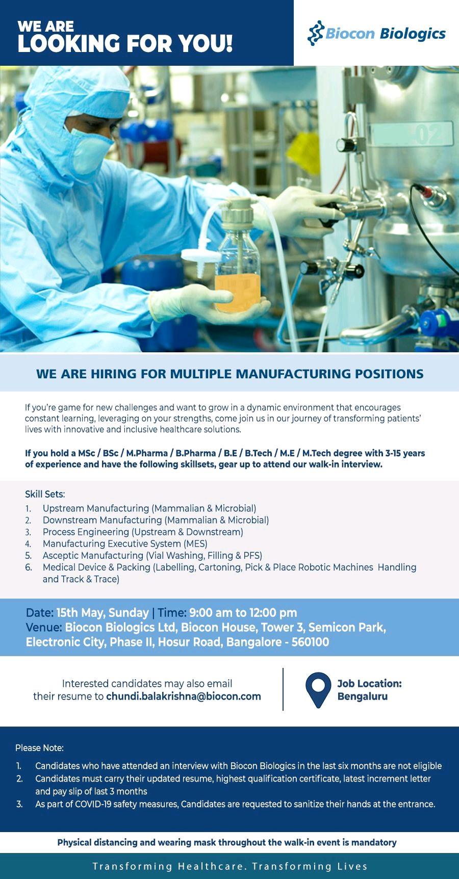 Biocon Biologics, a fully integrated global biosimilars organization, invites you to a Walk-In Drive for multiple manufacturing positions based in Bangalore on May 15, 2022, at Biocon Biologics Ltd., Biocon House, Tower 3, Semicon Park, Electronic City, Phase II, Hosur Road, Bengaluru – 560100