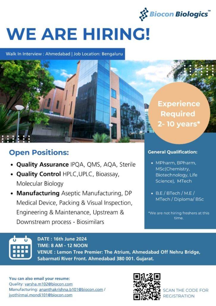 Biocon Biologics walk in interview for Quality Assurance / Quality Control & Manufacturing on 16th June 2024
