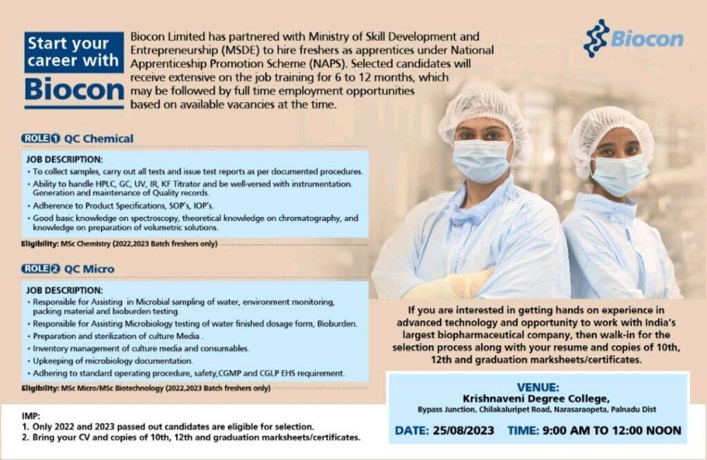 Biocon Limited has partnered with Ministry of Skill Development and Entrepreneurship (MSDE) to hire freshers as apprentices under National Apprenticeship Promotion Scheme (NAPS). Selected candidates will receive extensive on the job training for 6 to 12 months, which may be followed by fulltime employment opportunities based on available vacancies at the time