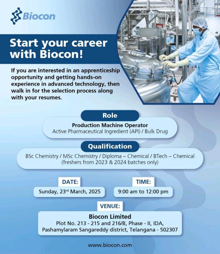 Qualification: BSc Chemistry / MSc Chemistry / Diploma – Chemical / BTech – Chemical (freshers from 2023 & 2024 batches only)