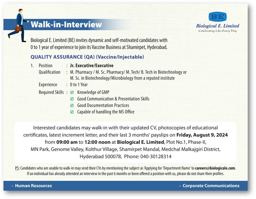 Interested candidates may walk-in with their updated CV, photocopies of educational certificates, latest increment letter, and their last 3 months’ payslips on Friday, August 9, 2024 from 09:00 am to 12:00 noon at Biological E. Limited, Plot No.1, Phase-II, MN Park, Genome Valley, Kolthur Village, Shamirpet Mandal, Medchal Malkajgiri District, Hyderabad 500078, Phone: 040-30128314