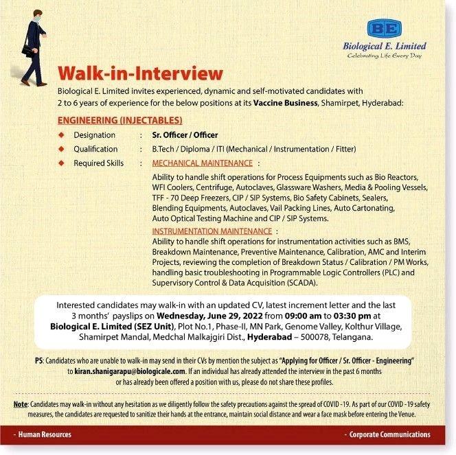 Biological E. Limited Walk-in-Interview for Engineering (Injectable) department on June 29, 2022