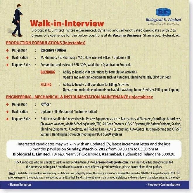 Biological E Limited Walk In Interview for Production Formulations ( Injectables) & Engineering department on 6th March 2022