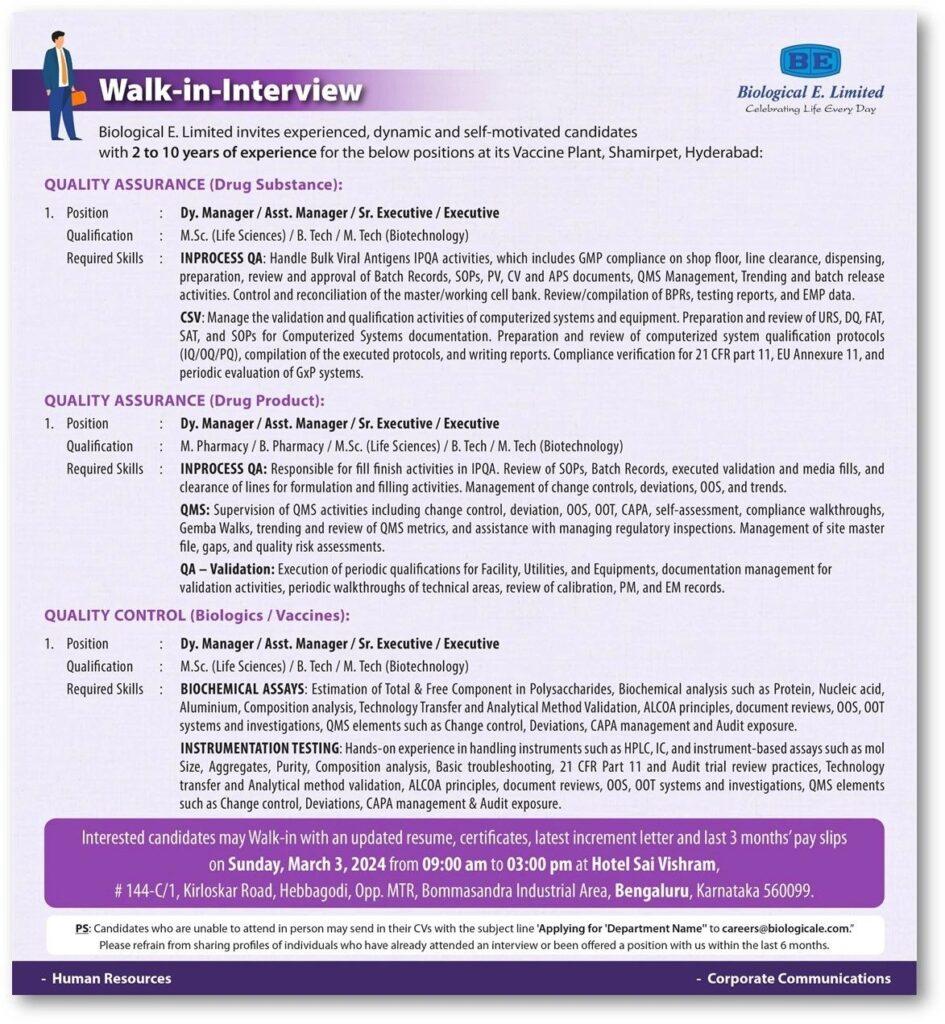 Biological E. Limited Walk-in interview for QA & QC requirements on 3rd Mar’24 in Bengaluru