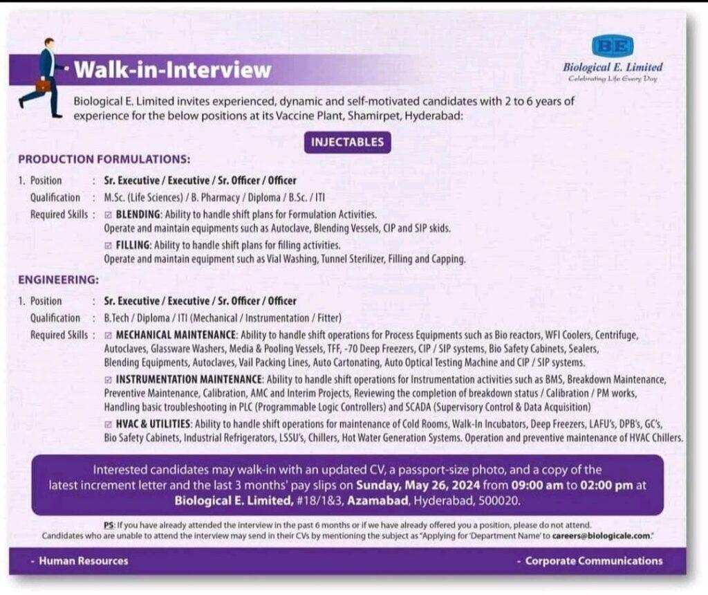 Biological E. Limited Walk-in-Interview for Sr.Executive/ Executive/ Sr. Officer/ Officer- QC & Production on Sunday, May 26, 2024