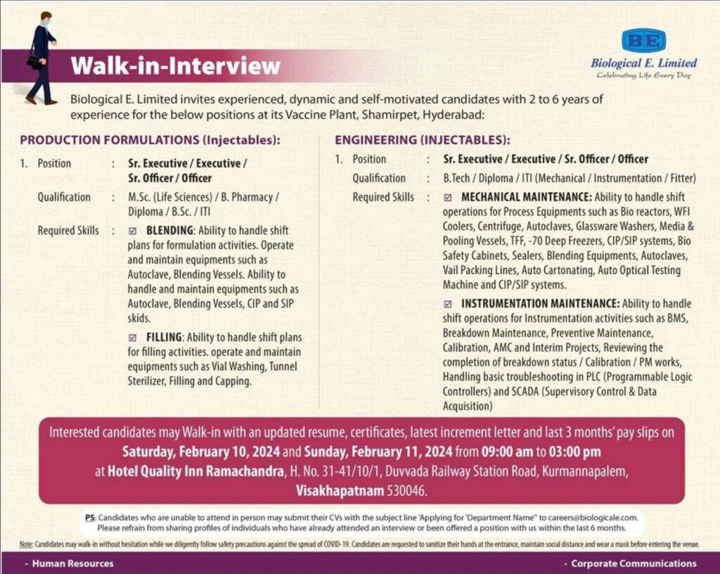 Biological E. Limited Walk-in-Interview on 10th & 11th February 2024