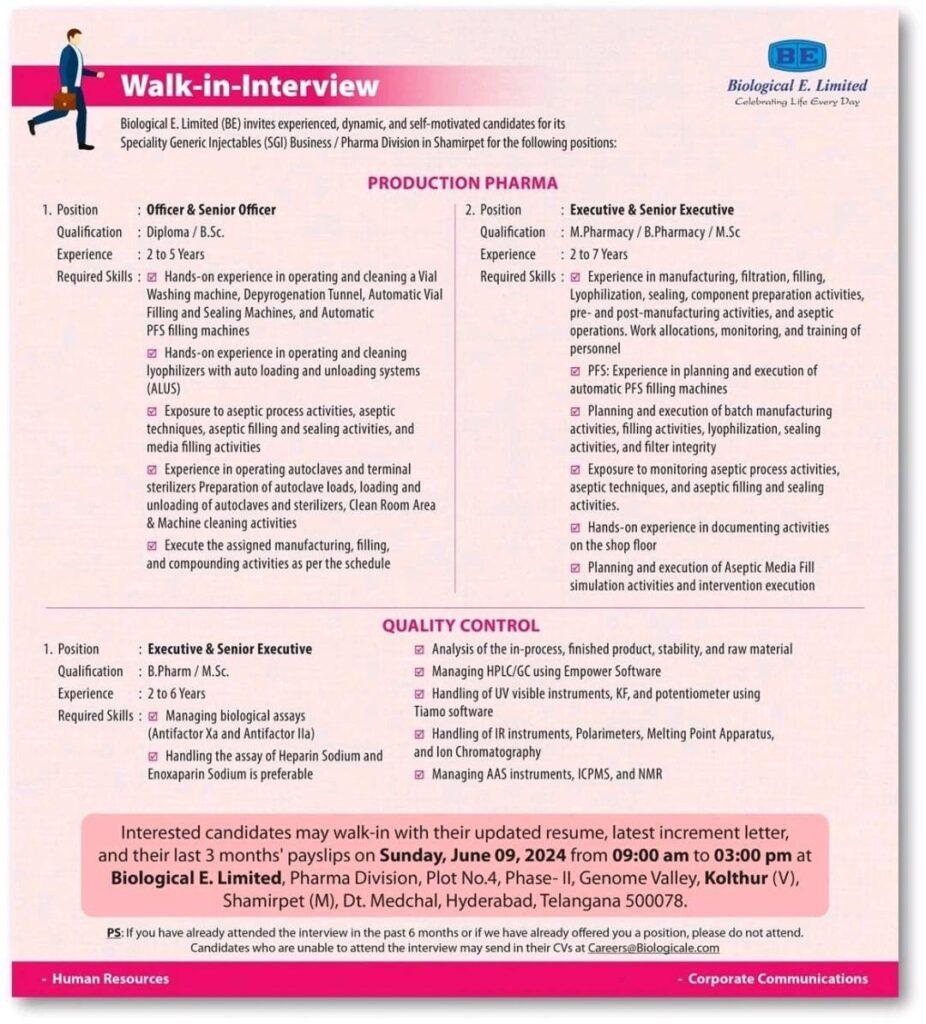 Interested candidates may walk-in with their updated resume, latest increment letter. and their last 3 months’ payslips on Sunday, June 09, 2024 from 09:00 am to 03:00 pm at Biological E. Limited. Pharma Division, Plot No.4, Phase-, Genome Valley, Kolthur (V), Shamirpet (M), Dt. Medchal, Hyderabad. Telangana 500078.