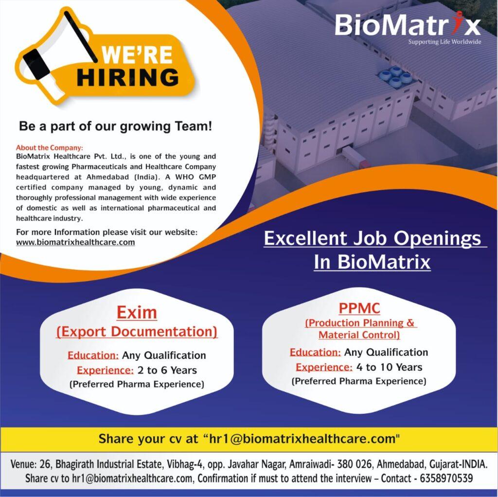 BioMatrix Healthcare Pvt. Ltd. Job Openings in QA, Exim(Export Documentation), PPMC & Packing – Formulation OSD department