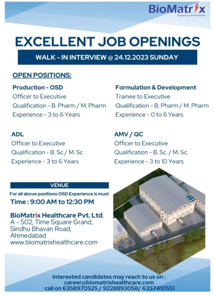 BioMatrix Healthcare walk in interview for Production, ADL, Formulation & Development, AMV/QC on 24.12.2023 Sunday