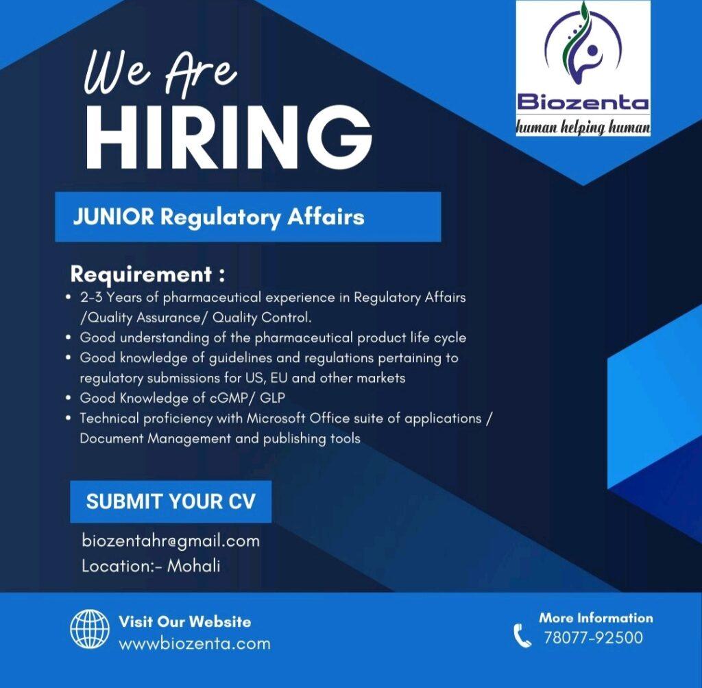 - 2-3 Years of pharmaceutical experience in Regulatory Affairs /Quality Assurance/ Quality Control.