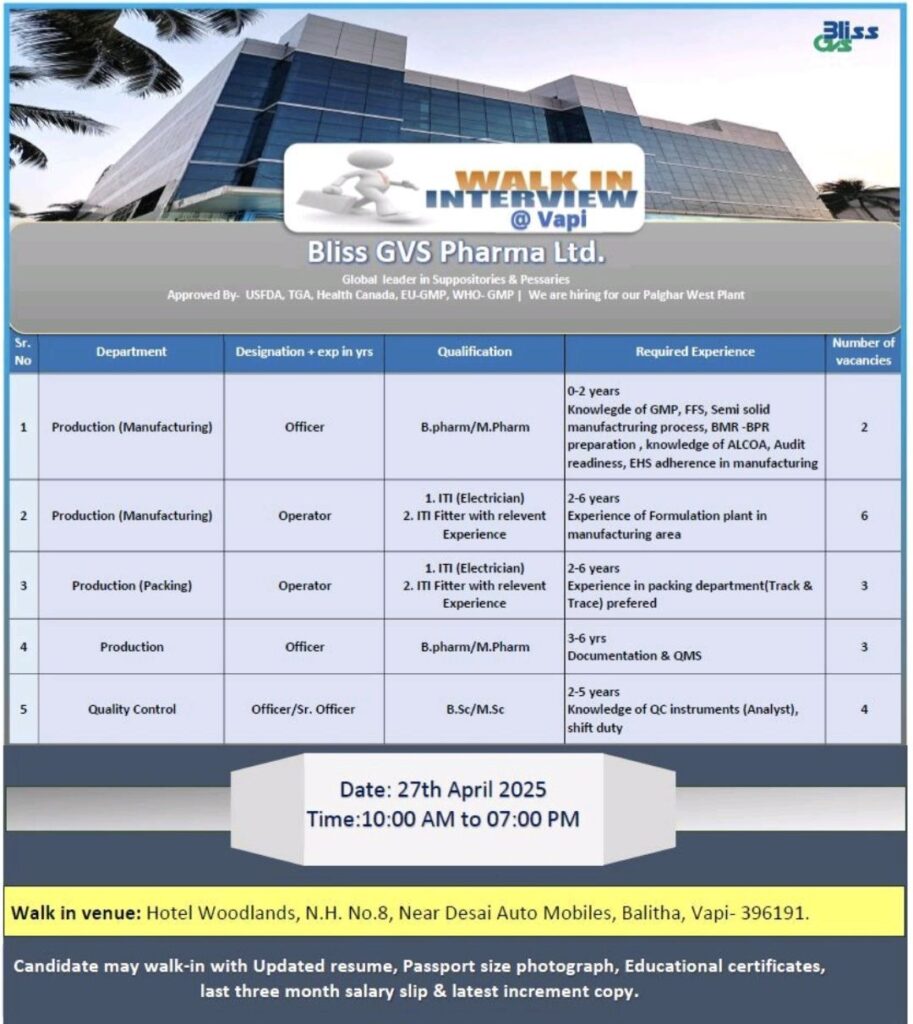 Bliss GVS Pharma Ltd., a global leader in the manufacturing of suppositories and pessaries, is conducting walk-in interviews for various positions at its Palghar West Plant. The company, which holds approvals from prestigious regulatory bodies such as the USFDA, TGA, Health Canada, EU-GMP, and WHO-GMP, is seeking qualified professionals to join its dynamic team.
