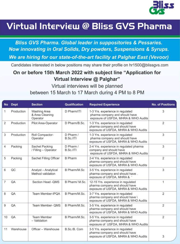 Bliss GVS Pharma Limited. 26Openings : Virtual Interview for Section Head, Officer, Analyst, Operator in Production, QA, QC, Packing & Warehouse Department at Palghar