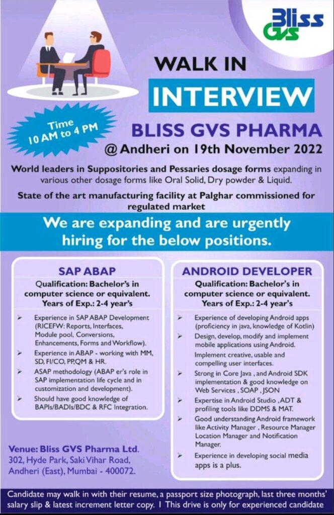 Bliss GVS Pharma Ltd Walk In Interview for SAP ABAP & ANDROID DEVELOPER @Andheri on 19th November 2022
