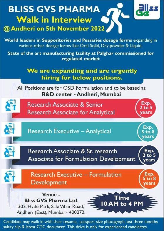 BLISS GVS PHARMA Walk in Interview @Andheri on 5th November 2022 -All Positions are for OSD Formulation and to be based at R&D center – Andheri, Mumbai