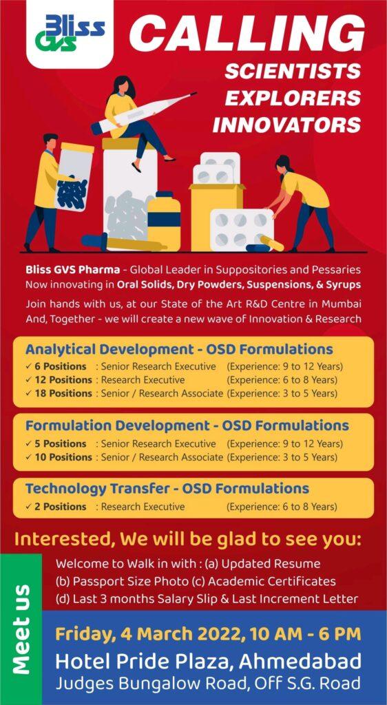 Bliss GVS Pharma Walk-in Interview for OSD Formulations- Analytical Development/ Formulation Development & Technology Transfer department on 4 March 2022