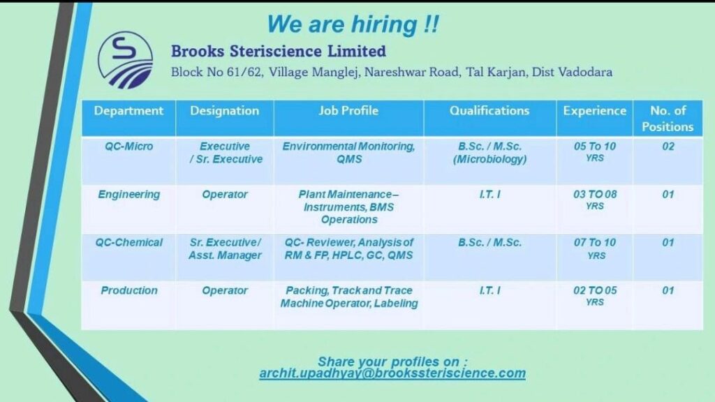 Interested candidates can share their CVs on archit.upadhyay@brookssteriscience.com