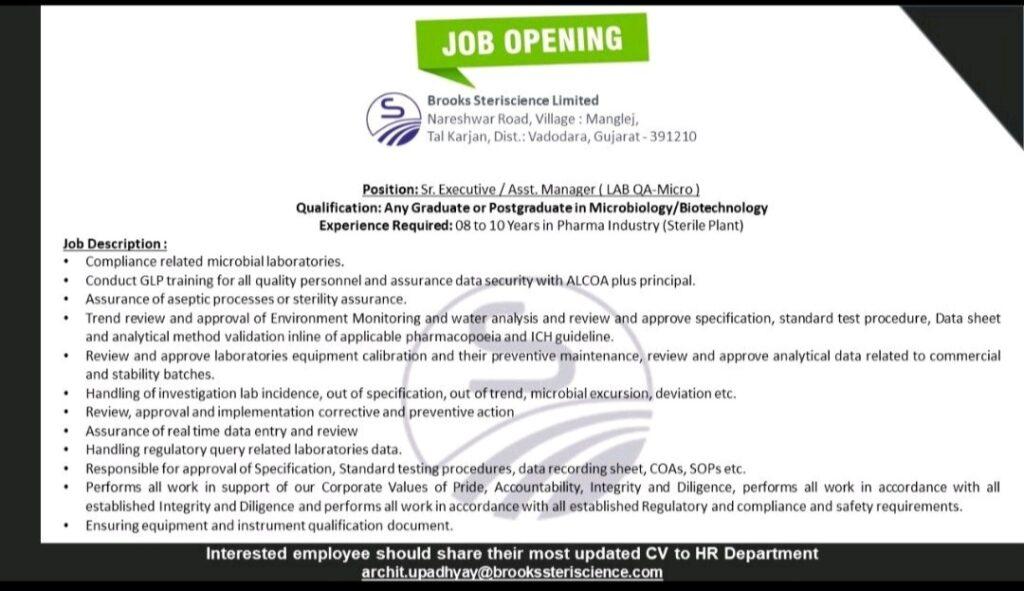 Position: Sr. Executive/Asst. Manager (LAB QA-Micro)
