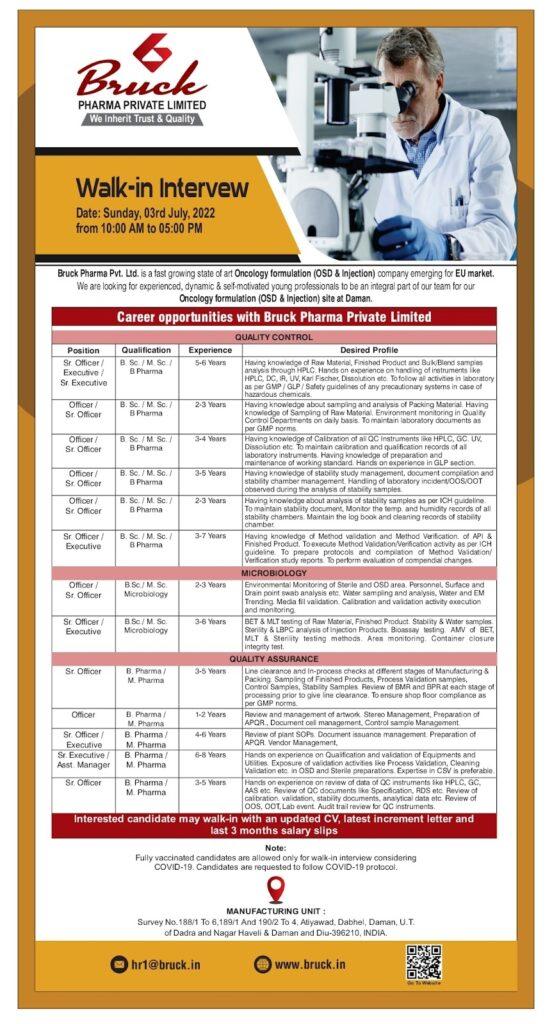 Bruck Pharma Pvt. Ltd. Walk In Interview for QA, QC & Microbiology on Sunday, 03rd July 2022