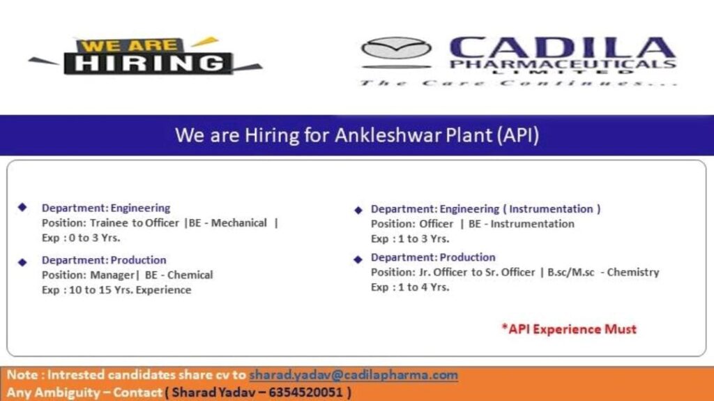 Note: Intrested candidates share cv to sharad.yadav@cadilapharma.com
