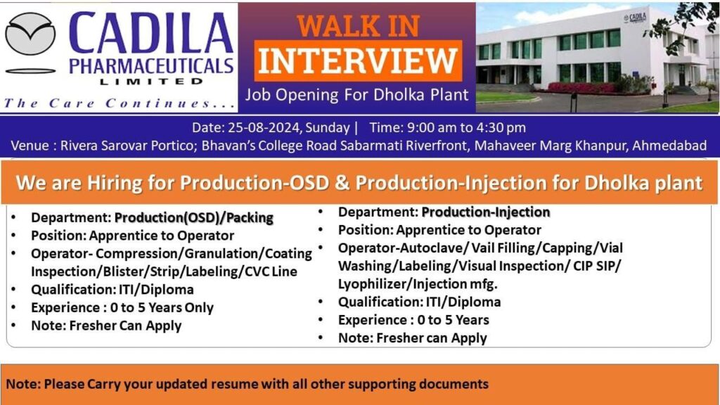 CADILA PHARMA Job Opening For Dholka Plant, Apprentice to Operator in Production department