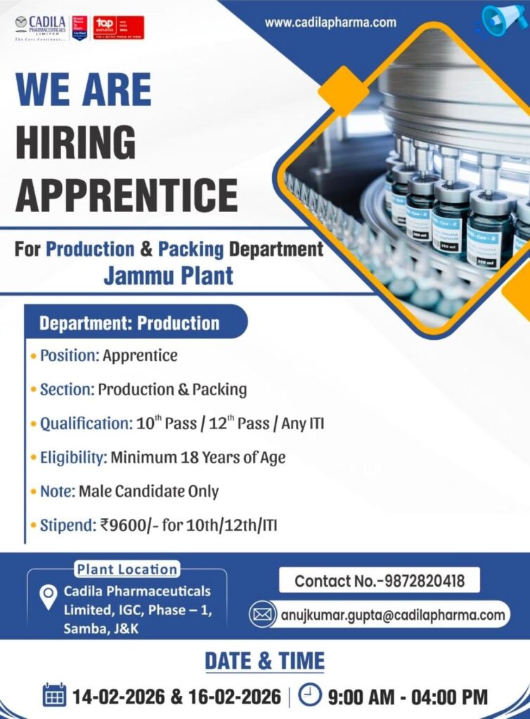 If you are looking to kickstart your career in the pharmaceutical industry, Cadila Pharmaceuticals Limited has announced an exciting recruitment drive for its Jammu facility. This is a prime opportunity for young professionals to gain hands-on experience in one of India’s leading healthcare companies.