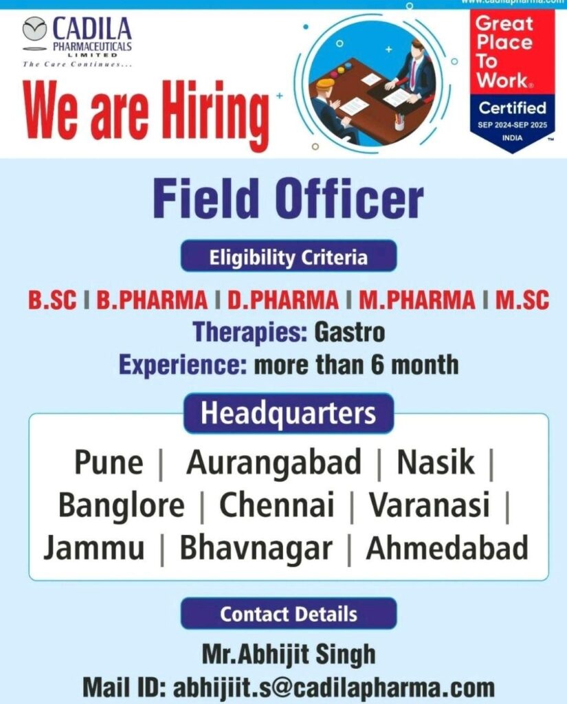 Cadila Pharmaceuticals Limited, one of the leading Indian pharmaceutical companies, has announced recruitment for the post of Field Officer in multiple major cities across India. This is a great opportunity for candidates who want to build their career in Pharma Sales & Marketing (Gastro Therapy segment).