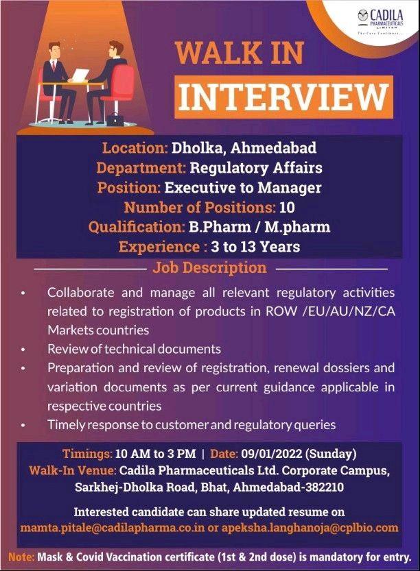 Cadila Pharmaceuticals, Walk In Interview for Regulatory Affairs Department on 9th January 2022