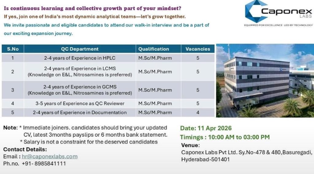 Caponex Labs, one of India’s most dynamic analytical teams, is officially inviting eligible candidates to join their expanding journey. If continuous learning and collective growth are part of your professional mindset, this walk-in interview is your gateway to a premier career in the pharmaceutical and analytical industry.