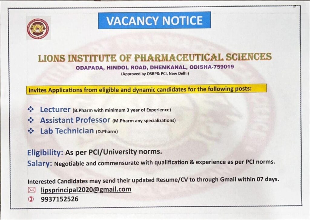 Lions Institute of Pharmaceutical Sciences, a reputed institution located in Odapada, Hindol Road, Dhenkanal, Odisha, is inviting applications from qualified and dynamic professionals to join its academic and technical team. This is an excellent opportunity for individuals passionate about pharmaceutical education and looking to contribute to a growing institution.