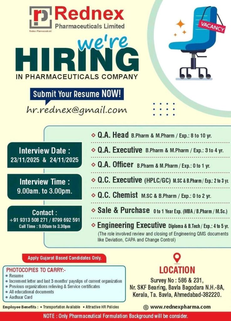 Rednex Pharmaceuticals Company is expanding its dynamic team and invites qualified professionals from Gujarat to explore exciting career opportunities in the pharmaceutical formulation sector. With a commitment to quality and innovation, Rednex is looking for passionate individuals ready to contribute to its mission of excellence.