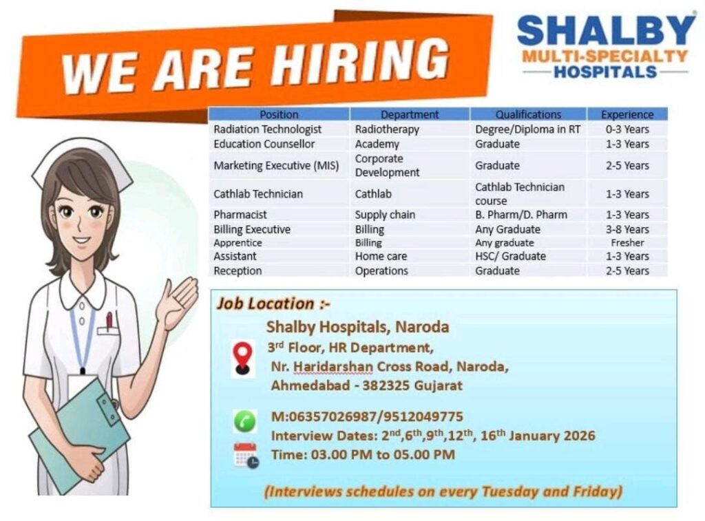Shalby Hospitals will be conducting walk-in interviews throughout January 2026. Interviews are scheduled for every Tuesday and Friday on the following dates: