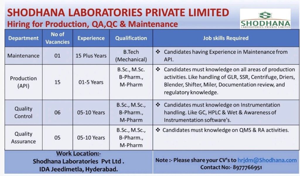 Interested candidates are invited to share their updated CVs at hrjdm@shodhana.com or contact 8977766951 for queries.