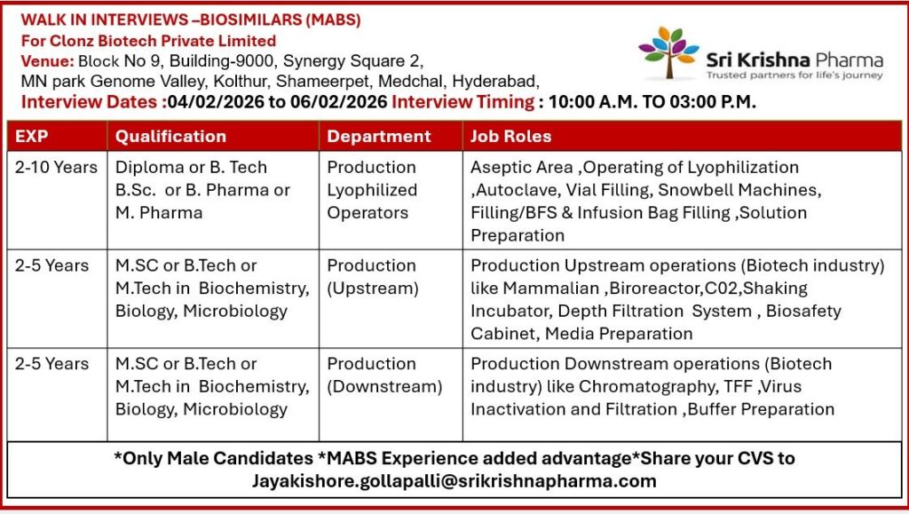Are you looking to advance your career in the rapidly growing field of Biosimilars and Monoclonal Antibodies (MABS)? Clonz Biotech Private Limited, in collaboration with Sri Krishna Pharma, is hosting a series of walk-in interviews in Hyderabad for experienced professionals in the biotechnology and pharmaceutical sectors.