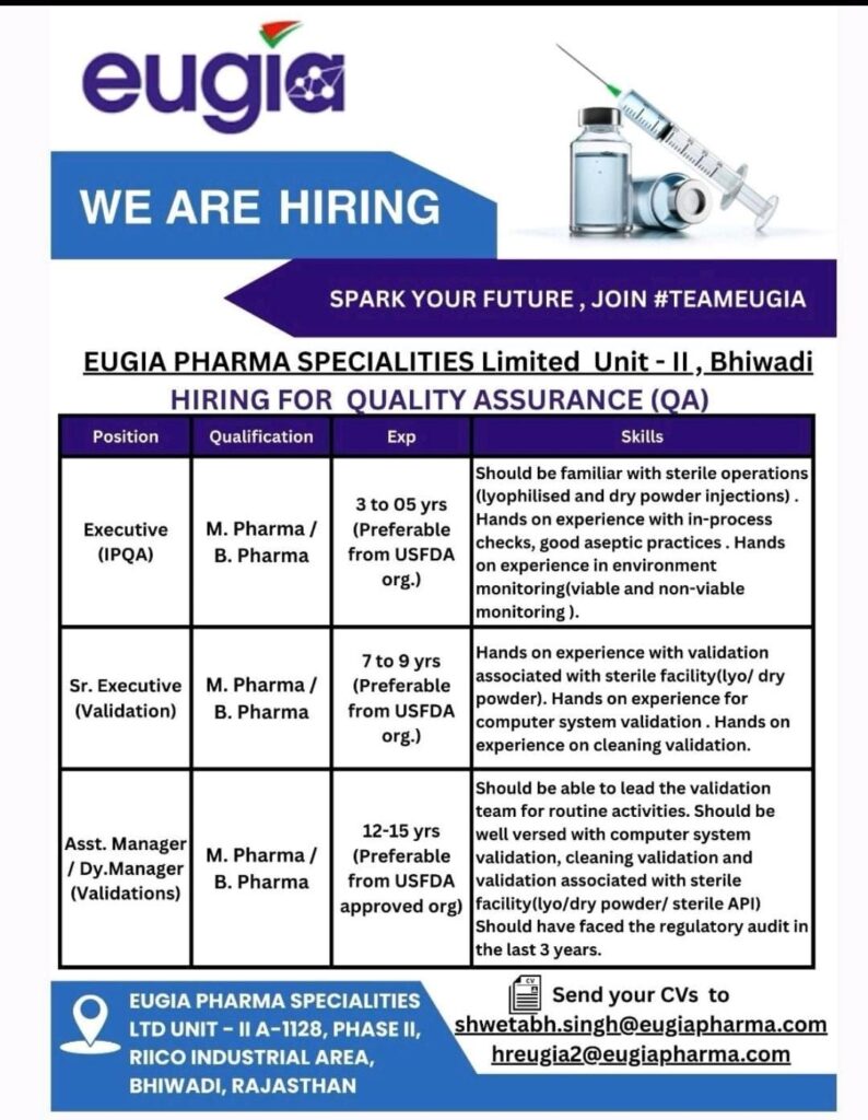 If you are a Quality Assurance professional looking to advance your career in the pharmaceutical industry, Eugia Pharma Specialities Limited has announced new openings at their Unit-II facility in Bhiwadi, Rajasthan. The company is specifically seeking experienced candidates for their sterile operations, focusing on injectable drug manufacturing.