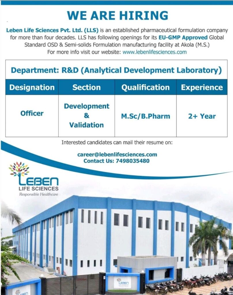 Leben Life Sciences Pvt. Ltd. (LLS), a well-established pharmaceutical formulation company with over 40 years of industry presence, has announced new job openings at its global standard manufacturing facility. The company is looking for qualified professionals to join its Analytical Development Laboratory (ADL) within the Research & Development department.