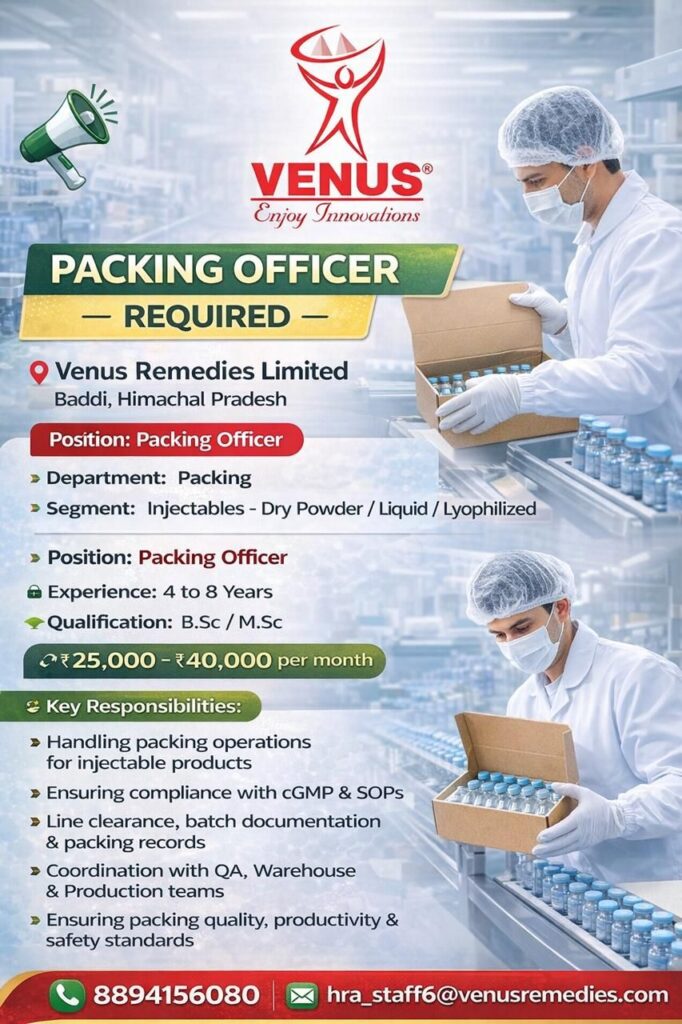 Venus Remedies Limited, a leading name in pharmaceutical innovation, is currently inviting applications for the position of Packing Officer at their manufacturing facility in Baddi, Himachal Pradesh. This is an excellent opportunity for pharmaceutical professionals with experience in injectables to join a dynamic and growth-oriented team.
