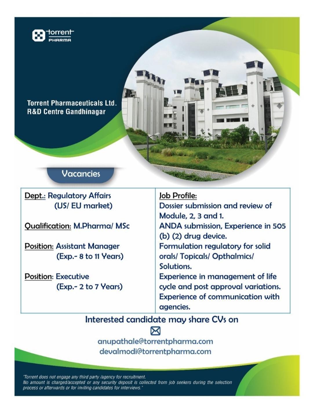 Torrent Pharmaceuticals, (R&D Centre), Gandhinagar (Gujarat) is hiring for Regulatory Affairs Department
