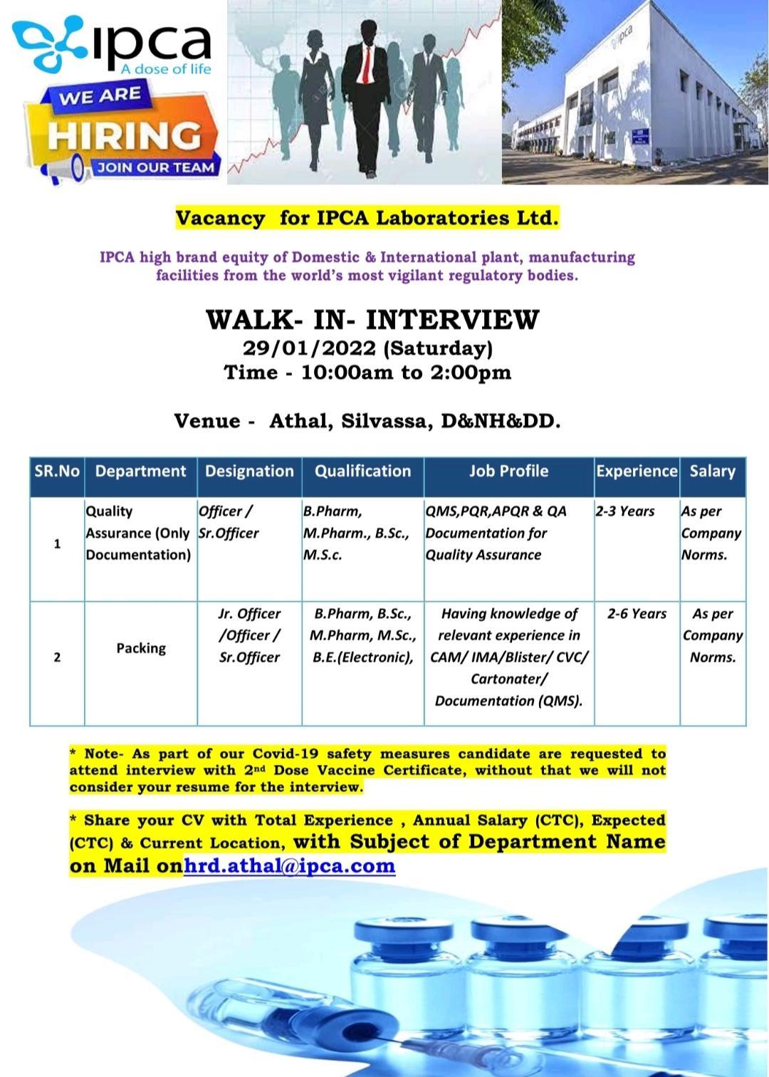 Ipca Laboratories Ltd. Walk-In Interviews for Quality Assurance & Packing Department on 29th Jan’ 2022