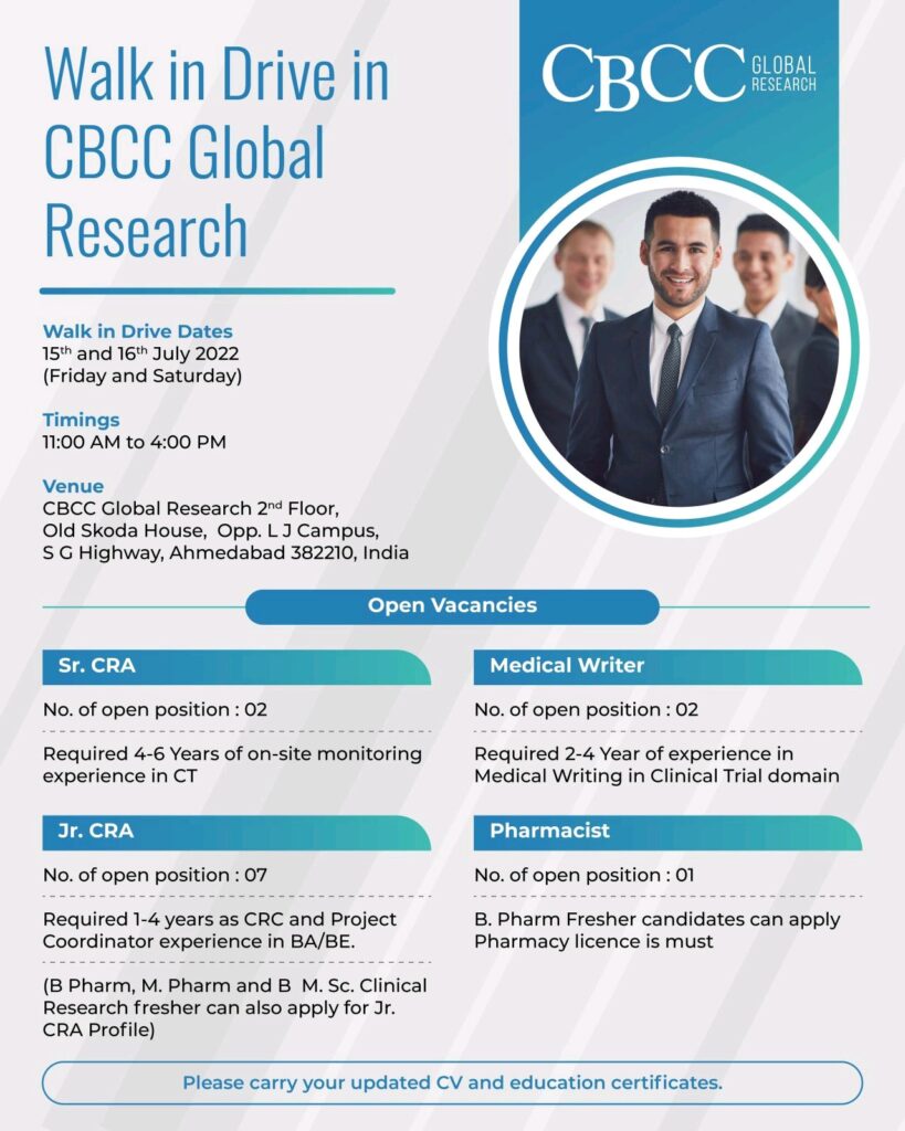CBCC Global Research Walk-in-Interview for Sr. CRA, Medical Writer, Jr. CRA, Pharmacist on 15th and 16th July 2022