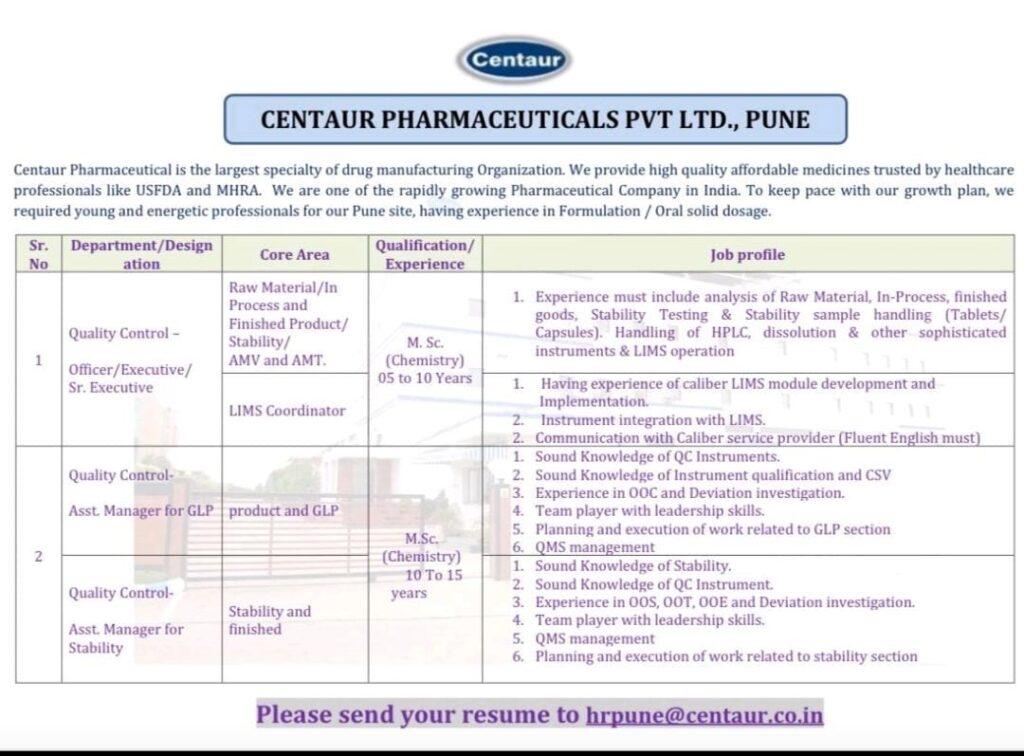 Centaur Pharmaceutical is the largest specialty of drug manufacturing Organization. We provide high quality affordable medicines trusted by healthcare professionals like USFDA and MHRA. We are one of the rapidly growing Pharmaceutical Company in India. To keep pace with our growth plan, we required young and energetic professionals for our Pune site, having experience in Formulation / Oral solid dosage.