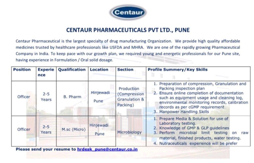 Centaur Pharmaceutical is the largest specialty of drug manufacturing Organization. We provide high quality affordable medicines trusted by healthcare professionals like USFDA and MHRA. We are one of the rapidly growing Pharmaceutical Company in India. To keep pace with our growth plan, we required young and energetic professionals for our Pune site, having experience in Formulation / Oral solid dosage.