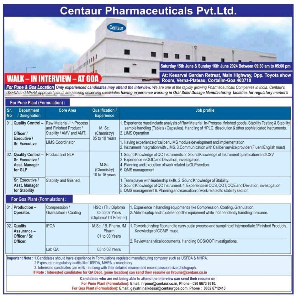 Centaur Pharmaceuticals walk in interview Officer/ Executive/ Sr. Executive/ Asst. Manager- Production, QA & QC on 15th & 16th June 2024