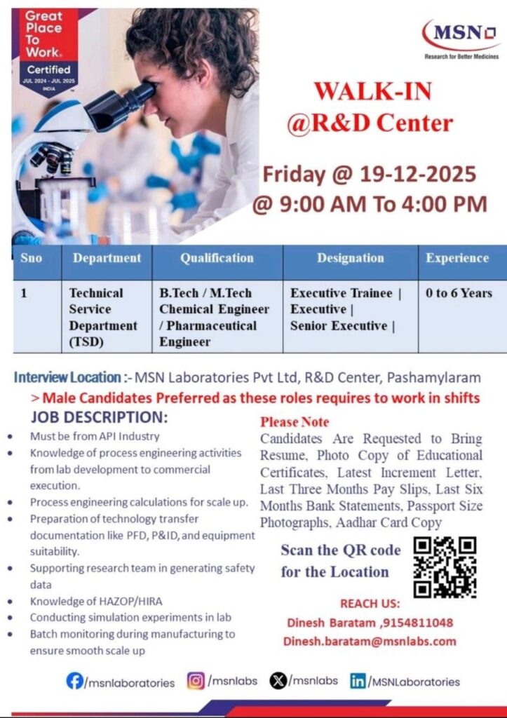 MSN Laboratories invites talented and ambitious B.Tech/M.Tech Chemical Engineers and Pharmaceutical Engineers to an exciting Walk-In Interview for roles in the Technical Service Department (TSD) at our R&D Center. This is a prime opportunity for driven professionals with 0 to 6 years of experience to join a leading name in ‘Research for Better Medicines.’