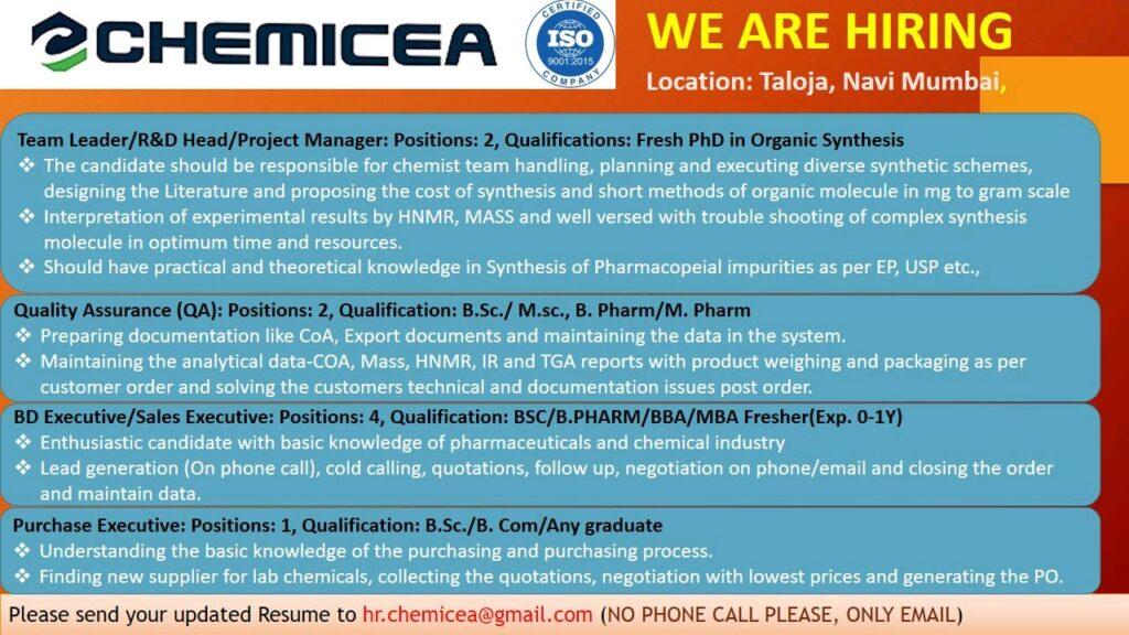 CHEMICEA hiring Freshers & experience for Team Leader/R&D Head/Project Manager/ QA/ BD & Purchase department