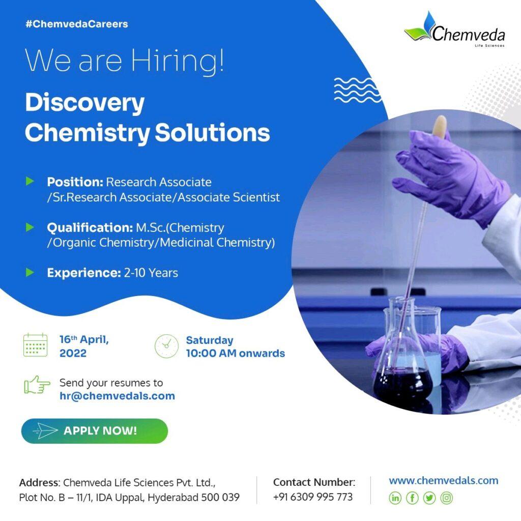Chemveda Life Sciences India hiring for Research Associate, Sr. Research Associate, and Associate Scientist in Discovery Chemistry Solutions