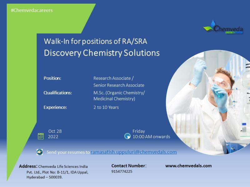 Chemveda Life Sciences Pvt Ltd. Conducting walk in interview on 28th Oct 2022 for multiple positions in Discovery Chemistry Solutions cro department
