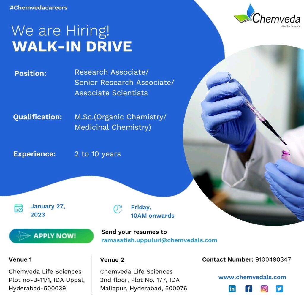 Chemveda Life Sciences- Walk in drive for Research Chemist/ Research Associate /Senior Research Associate for multiple positions in Discovery Chemistry Solutions on 27th Jan 2023
